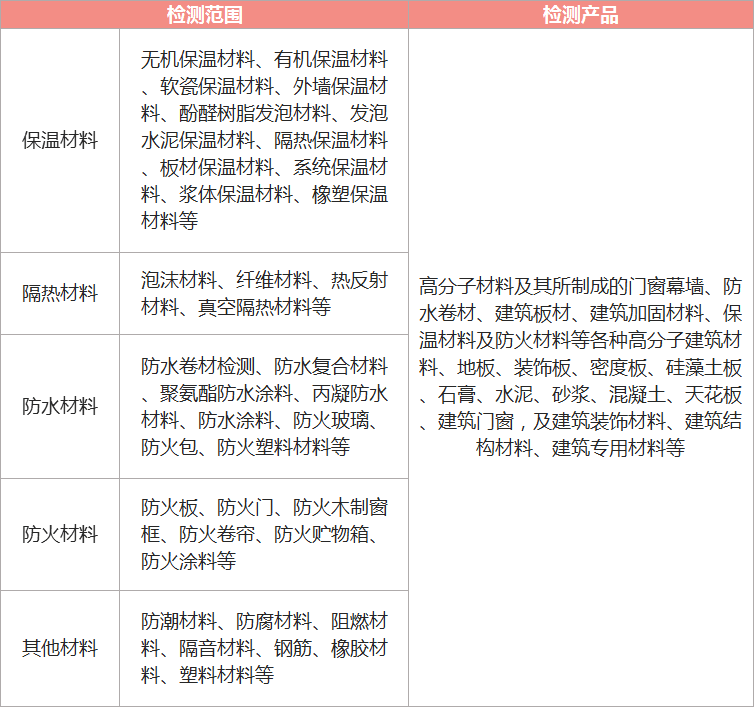 導(dǎo)熱系數(shù)、傳熱系數(shù)、熱阻、透濕性能、密度、吸水率、含水率、尺寸穩(wěn)定性、彎曲性能、壓縮性能、拉伸性能、壓縮..變形、撕裂強(qiáng)度、燃燒性能、吸聲性能、隔聲性能、相變溫度、抗風(fēng)壓性能、可靠性試驗(yàn)、耐候性檢測(cè)、老化檢測(cè)、環(huán)保檢測(cè)、含量測(cè)定、有毒有害檢測(cè)等。 |